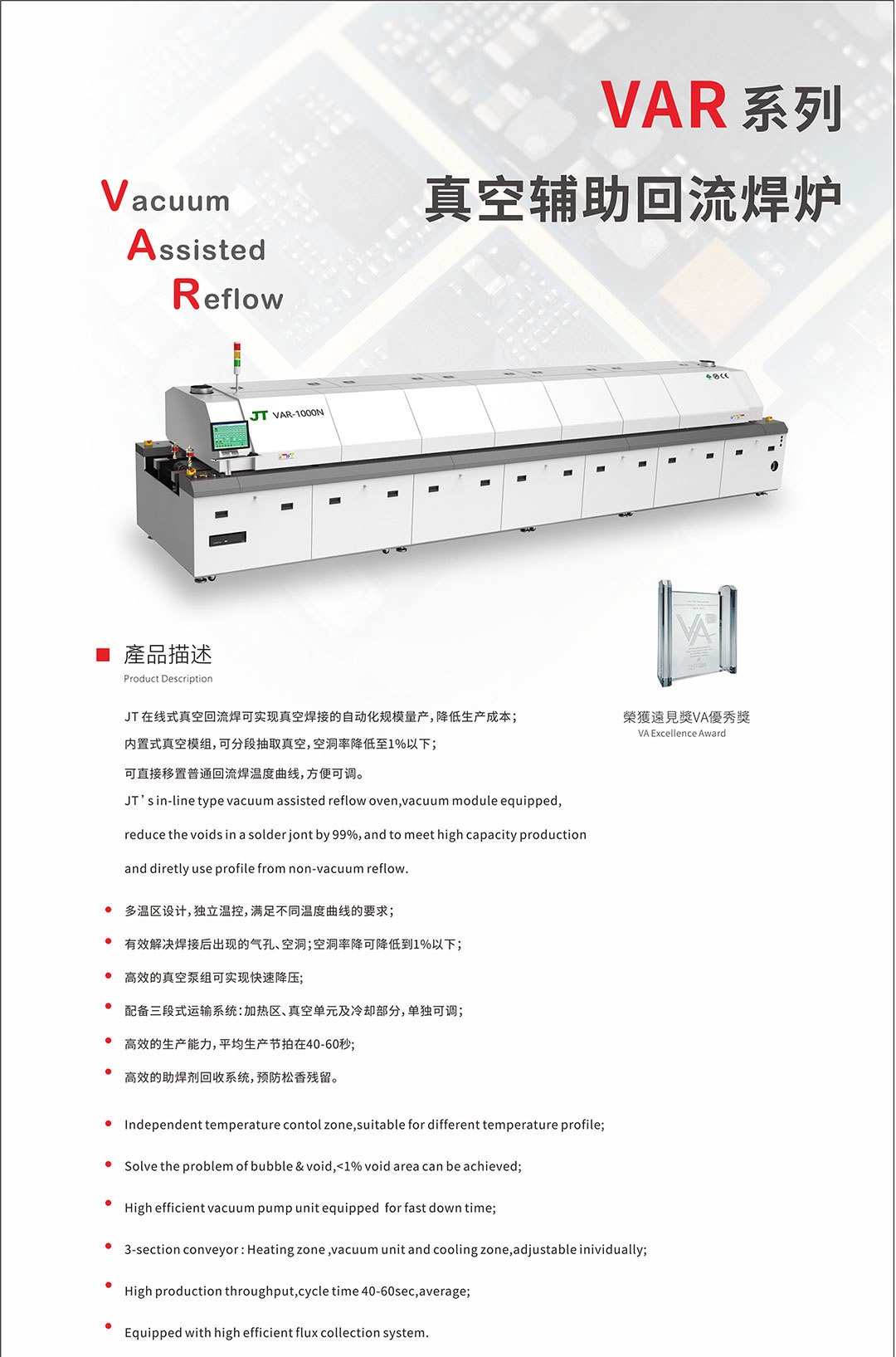 在線式真空回流焊可實現真空焊接的自動化規模量產,降低生產成本; 內置式真空模組,可分段抽取真空,空洞率降低至1%以下; 可直接移置普通回流焊溫度曲線,方便可調。